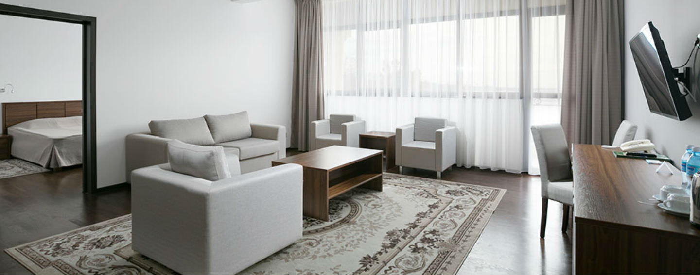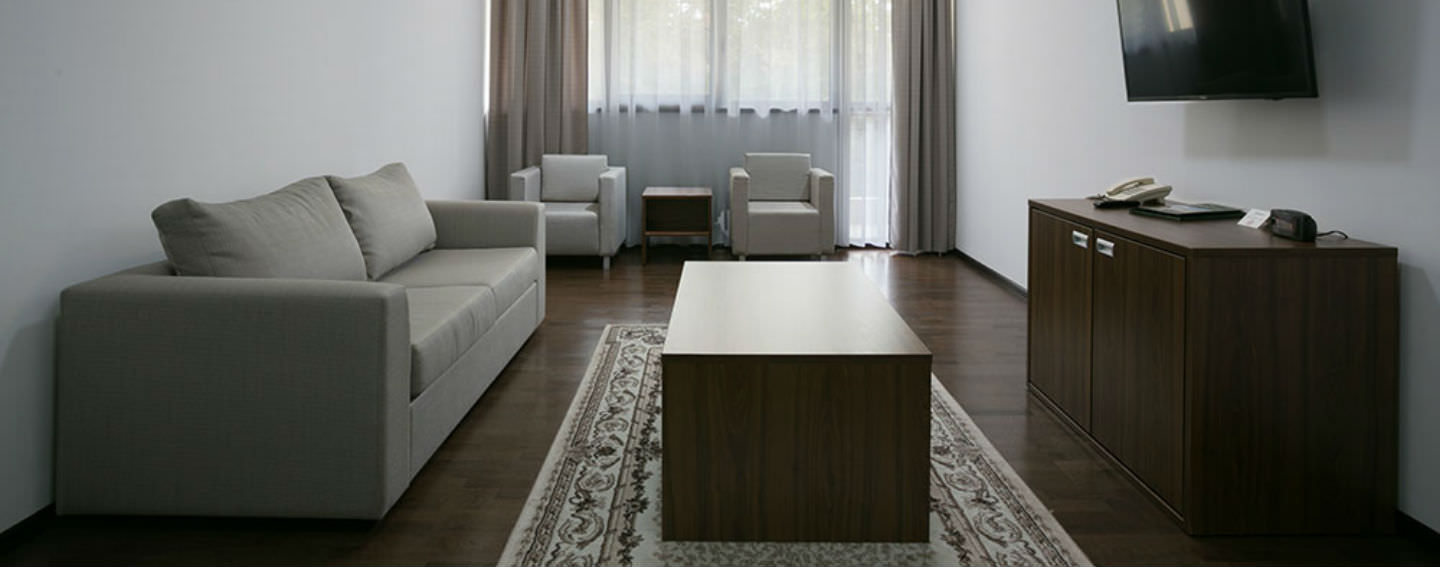 Просторный двухкомнатный люкс площадью 75 кв.м подойдет для проживания двух гостей. Вы сможете отдохнуть на балконе, где имеется удобная мебель.